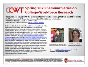 Dr. Allison Lombardi studies the transition from adolescence to adulthood, with a particular focus on college and career readiness (CCR) and higher education experiences of underrepresented groups, including students with disabilities. Join the conversation with CCWT Co-Director Matthew Hora and Dr. Lombardi on February 6, 2023.